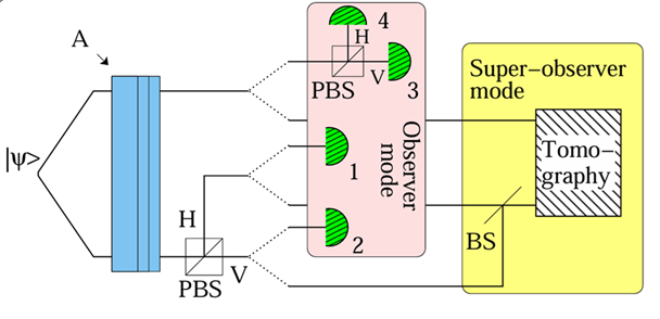 Fig. 1: Experimental setup for Observer mode (a) and Super-observer mode (b), where A denotes the birefringent plates, PBS is a polarising beam splitter and BS is a beam splitter.