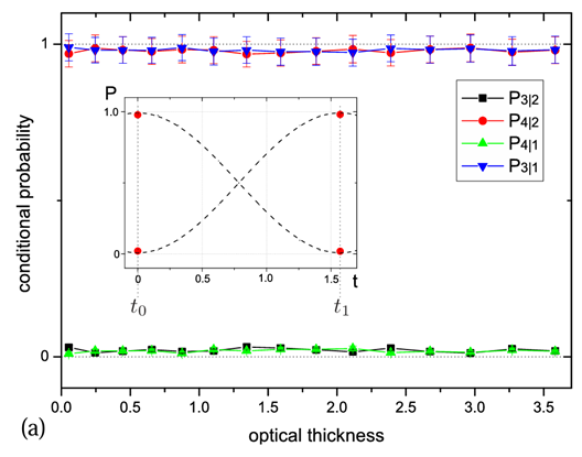 Fig. 2 shows that there is no dependence of the conditional probabilities on the abstract coordinate time represented by the thickness of the birefringent plates. Different plate thicknesses have no effect on the conditional probabilities obtained and thus on the time dependence of the second photon on the clock photon.