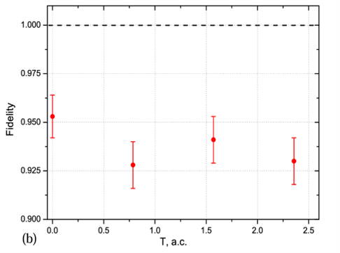 The conditional probabilities are calculated in the same way as for the internal observer. Here, the conditional probabilities calculated from the measurement results are compared with the conditional probabilities of the theoretical initial state. Fig. 3 shows the fidelity plotted as a function of the abstract coordinate time, where the fidelity is a measure of how much the initial and final states overlap and is given by $F= \langle \Psi_i | \Psi_f | \Psi_i \rangle$. As the graph shows, the fidelity is close to 1, meaning that the final state is close to the initial state, as expected of a static state.